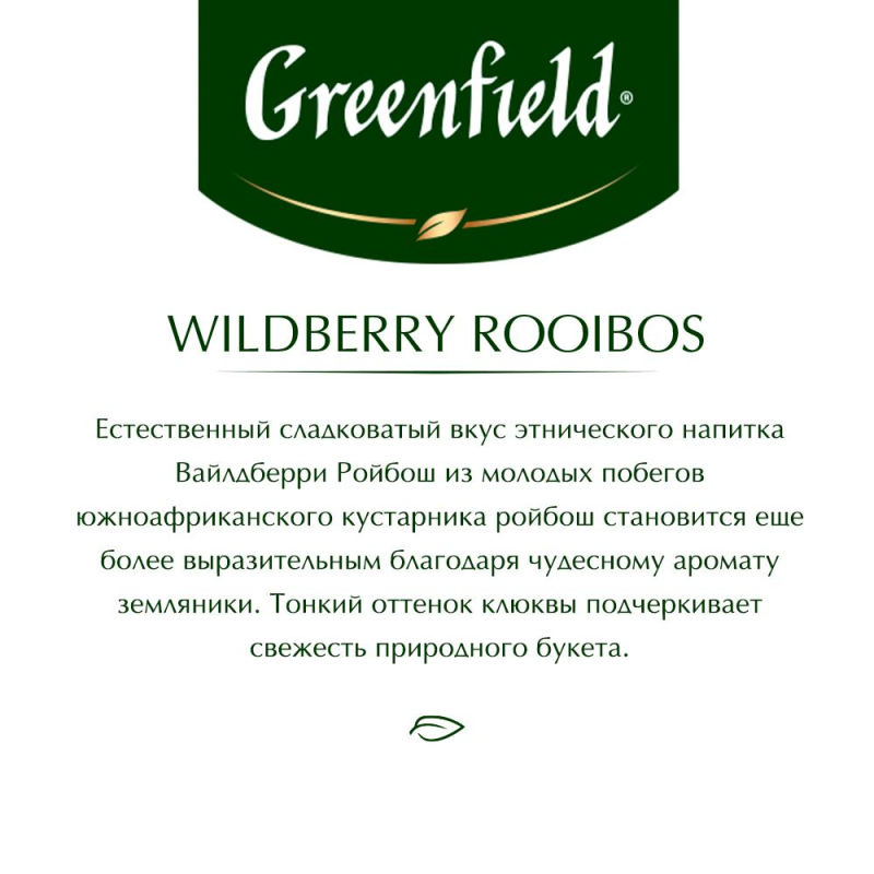 Чай ройбуш Greenfield Wildberry Rooibos 25 пакетиков (клюква, земляника). Чай Greenfield Wildberry Rooibos травяной с земляникой и клюквой. Естественный сладковатый вкус этнического напитка Greenfield Wildberry Rooibos из молодых побегов южноафриканского кустарника ройбуш становится еще более выразительным благодаря чудесному аромату земляники, а тонкий оттенок клюквы подчеркивает свежесть природного букета.Состав: ройбуш, гибискус, ароматизатор клюква, кусочки ягод земляники, кусочки ягод клюквы.Способ приготовления: залейте чайный пакетик 200 миллилитров горячей воды. Дайте чаю настояться 7-9 минут.Количество пакетиков в упаковке: 25 штук. Тип упаковки: картонная коробка.Условия хранения: хранить в чистом, хорошо вентилируемом помещении без посторонних запахов при относительной влажности воздуха не более 70%.Страна производства: Россия.