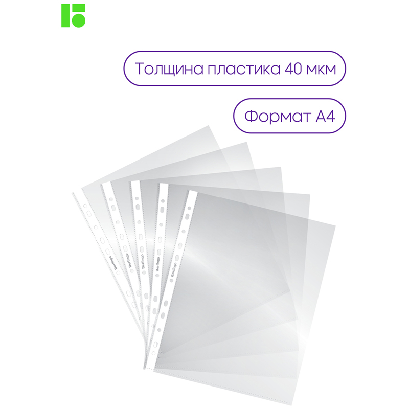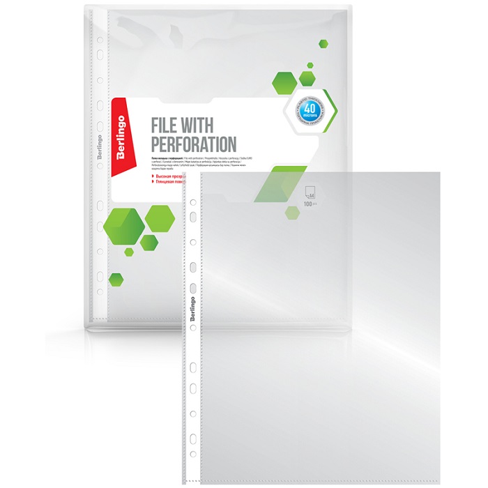 Папка - вкладыш с универсальной перфорацией. Для хранения неперфорированных документов А4 в любых папках. Яркий информационный лист-вкладыш А4 в каждой групповой упаковке (100 штук) и логотип на боковой ленте. Толщина пластика 40 мкм, глянцевая поверхность, высокая прозрачность.