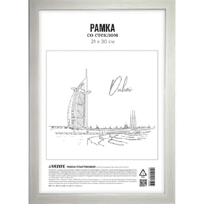 Рамка пластиковая "deVENTE" 21x30 см, формат A4, серия 6/1(багет 15 х 12,4 мм), вставка- стекло, задняя панель - переплетный картон, с креплением для подвеса, Nordic, в термоусадочной пленке.