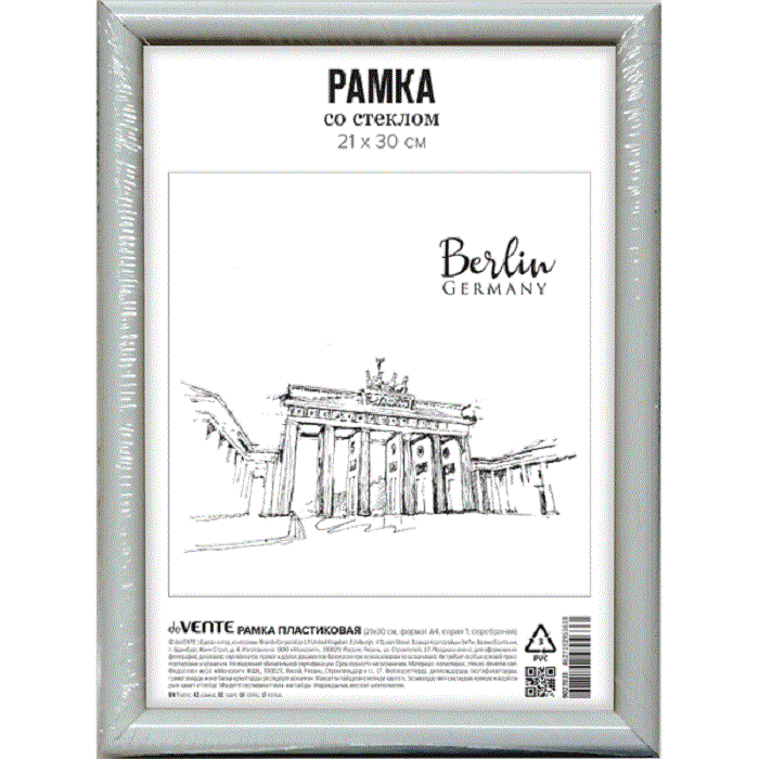Рамка пластиковая "deVENTE" 21x30 см, формат A4, серия 6/1(багет 15 х 12,4 мм), вставка- стекло, задняя панель - переплетный картон, с креплением для подвеса, серебряная, в термоусадочной пленке.