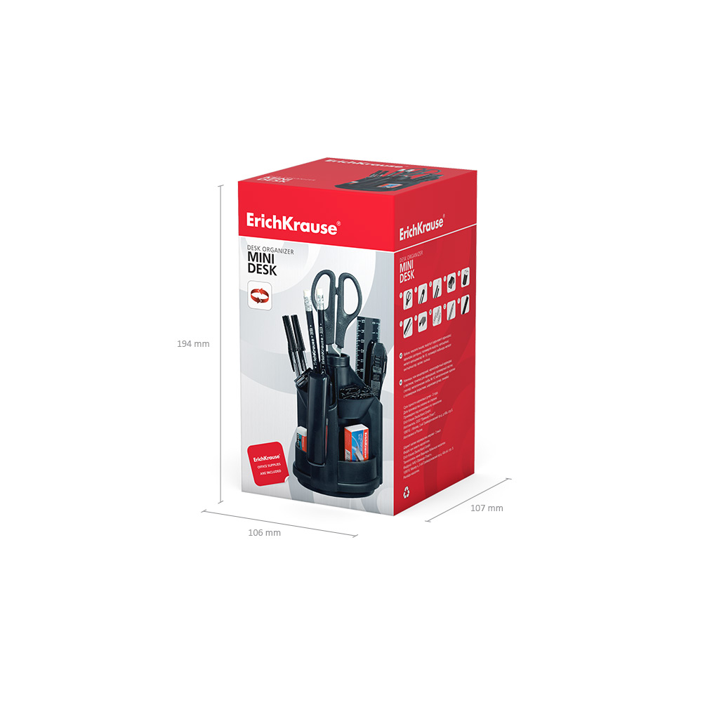 Предназначена для удобного хранения настольных принадлежностей. Компактна и эргономична. Оснащена вращающимся механизмом. В комплекте 12 предметов: степлер № 10, 1000 скоб, 2 ручки, 2 карандаша, линейка, 30 скрепок, точилка, ластик, ножницы, нож канцелярский. Наполнение может отличаться от представленного.