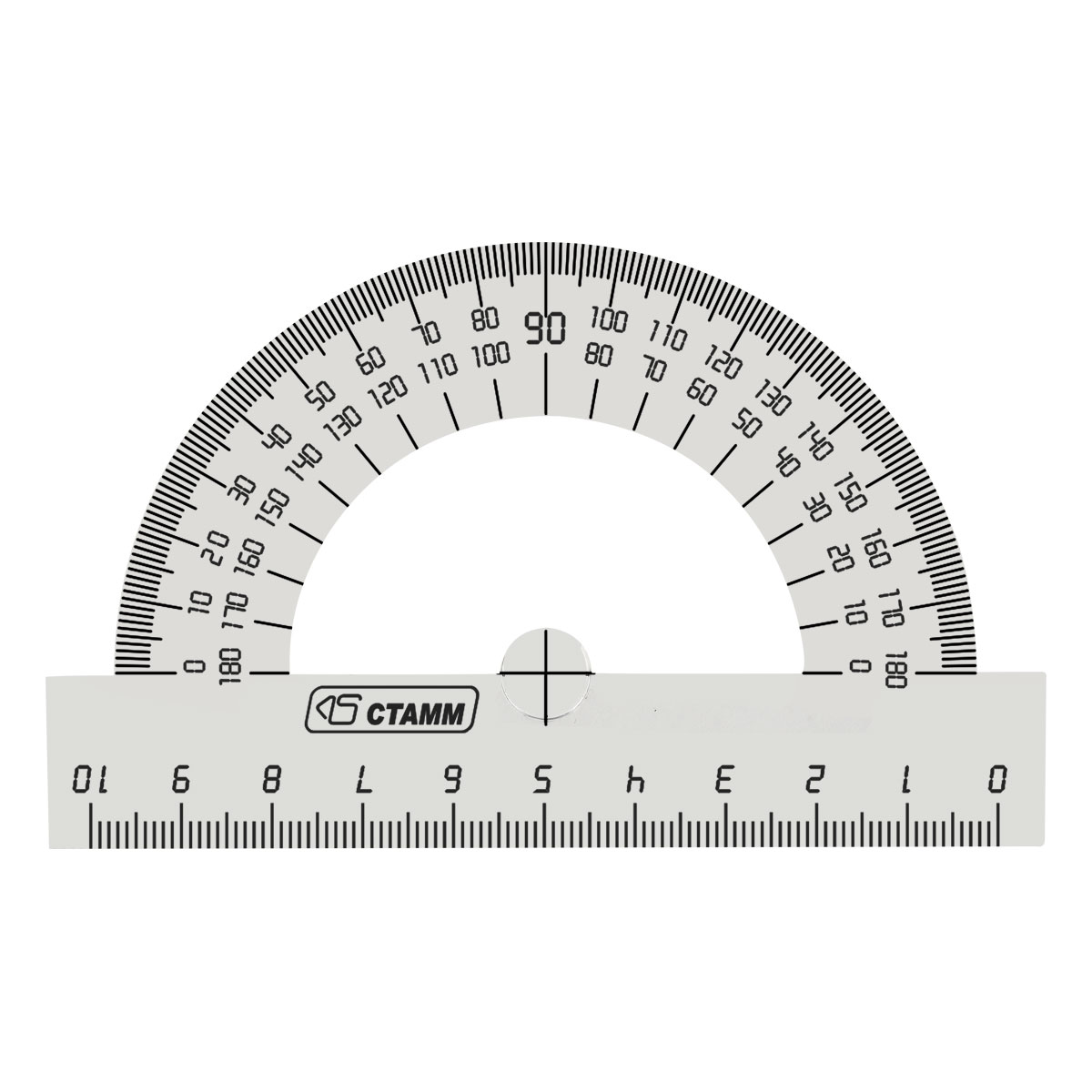 Транспортир СТАММ – незаменим для чертёжных и измерительных работ. Окружность изделия – 180°, длина – 10 см. Товар является прочным. Отверстие для карандаша позволяет точно находить центр и вычерчивать окружность. У транспортира ровная и чёткая миллиметровая шкала, безопасные закруглённые края и гладкая глянцевая поверхность.