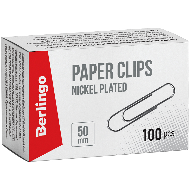 Большие скрепки изготовлены из стали, имеют классическую овальную форму и блестящее никелевое покрытие. Длина скрепки составляет 50 мм. Не окисляются и не повреждают документы. 50 штук в картонной коробке.