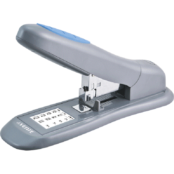 Степлер большой мощности "deVENTE" (до 100 листов, глубина скрепления 65 мм, для скоб 23/6-23/13) в картонной коробке, серый с синими каучуковыми вставками.